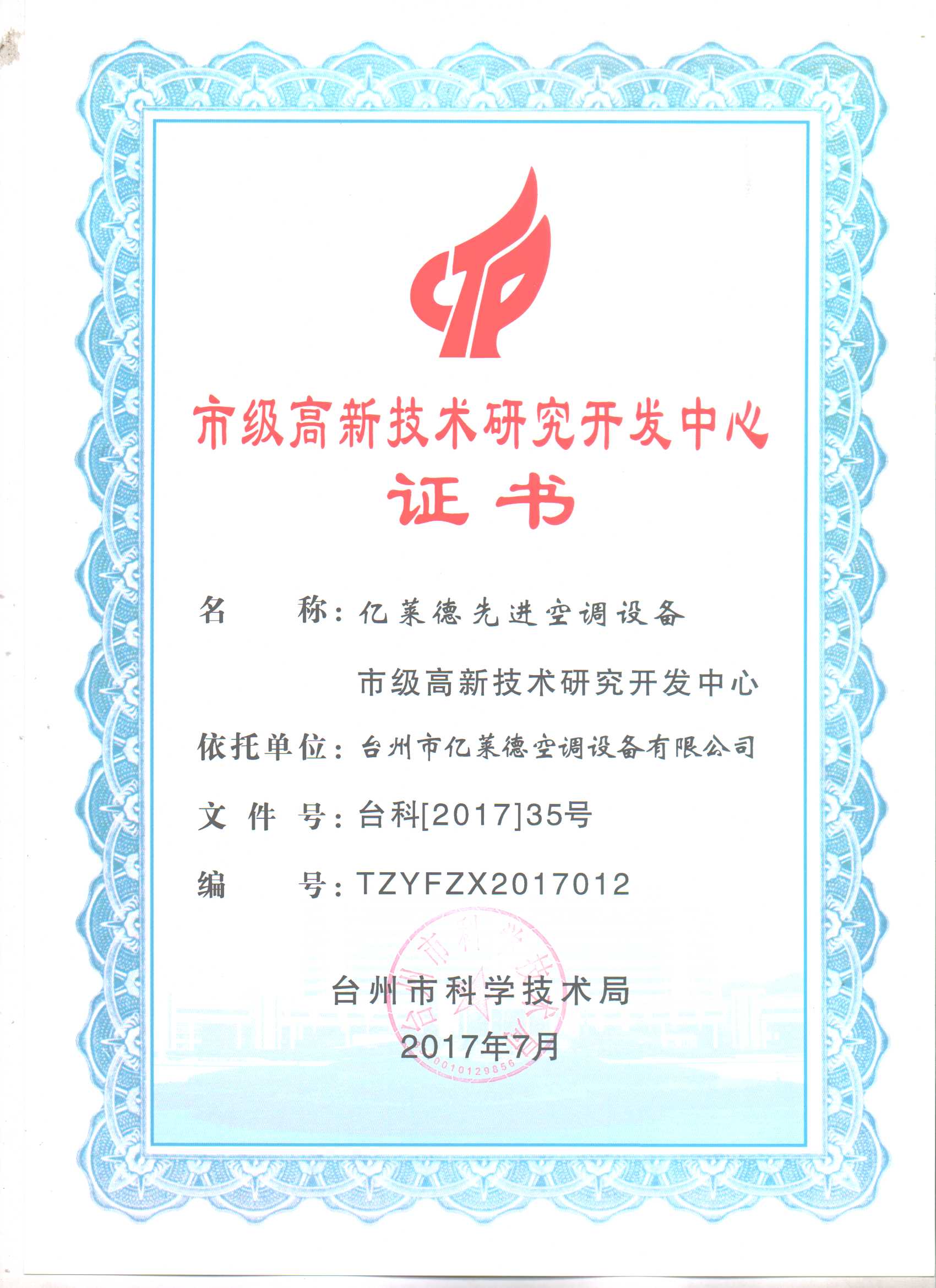 市級(jí)高新技術(shù)研究開(kāi)發(fā)中心證書