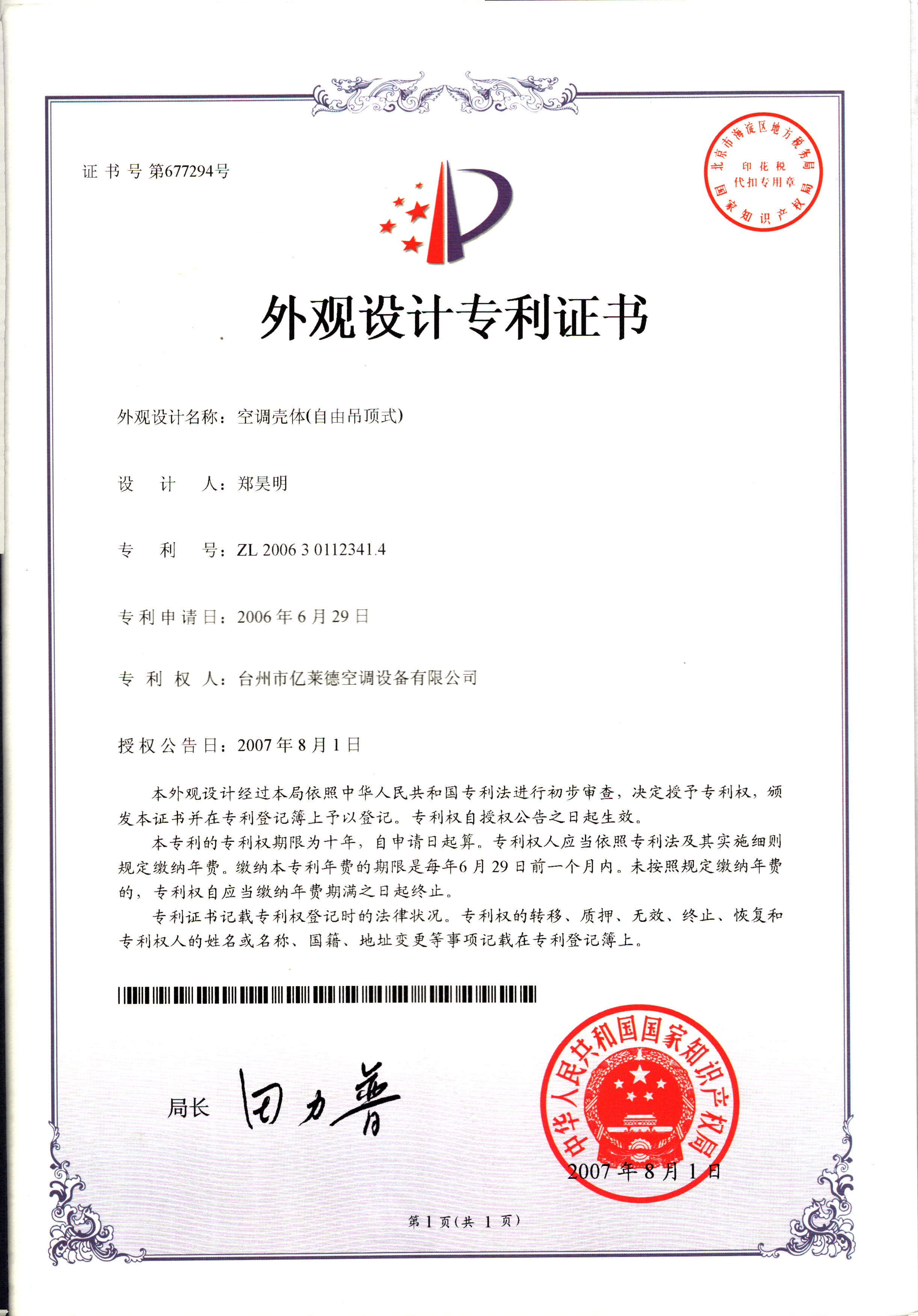 外觀設(shè)計(jì)專利證書--空調(diào)殼體(自由...