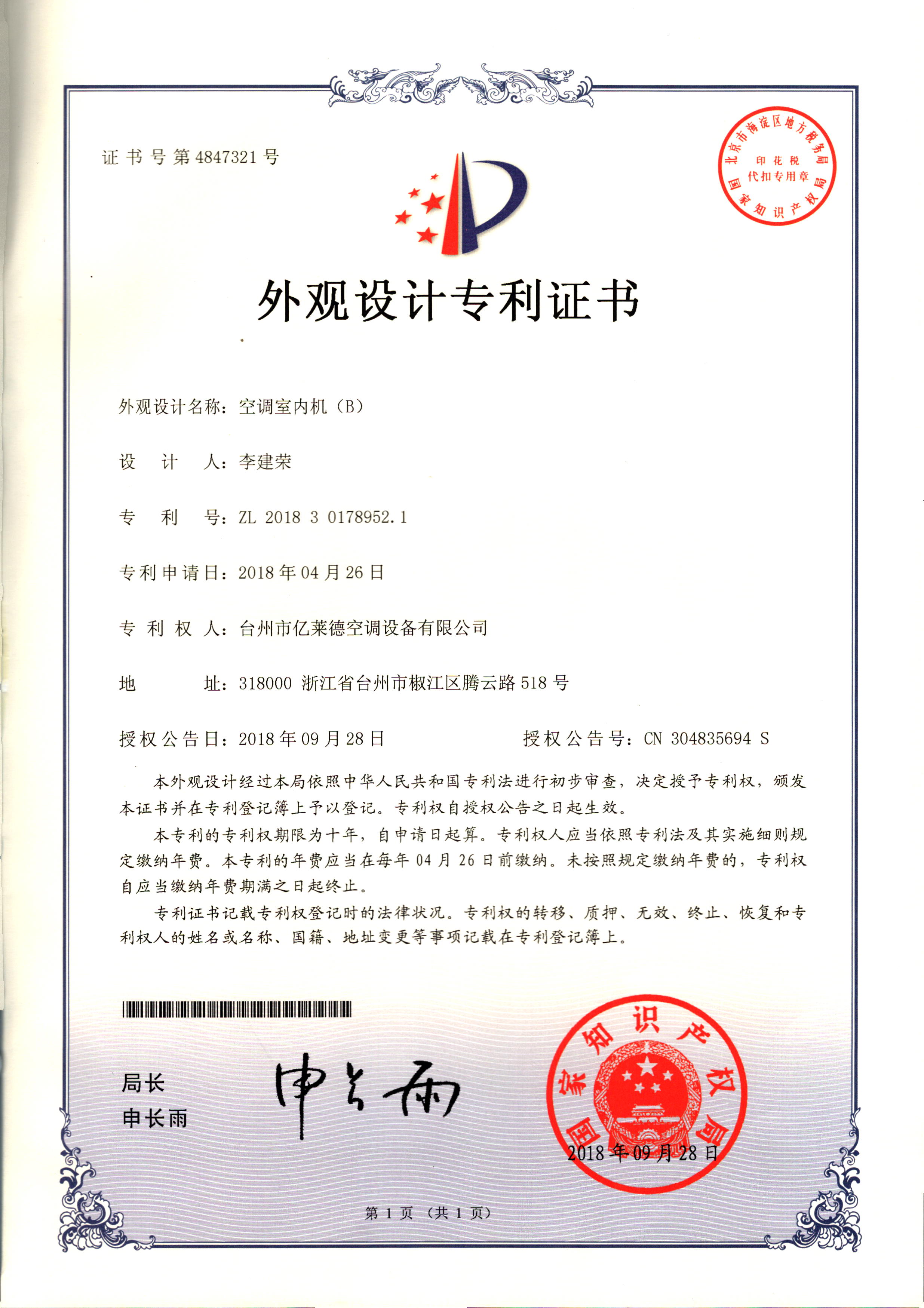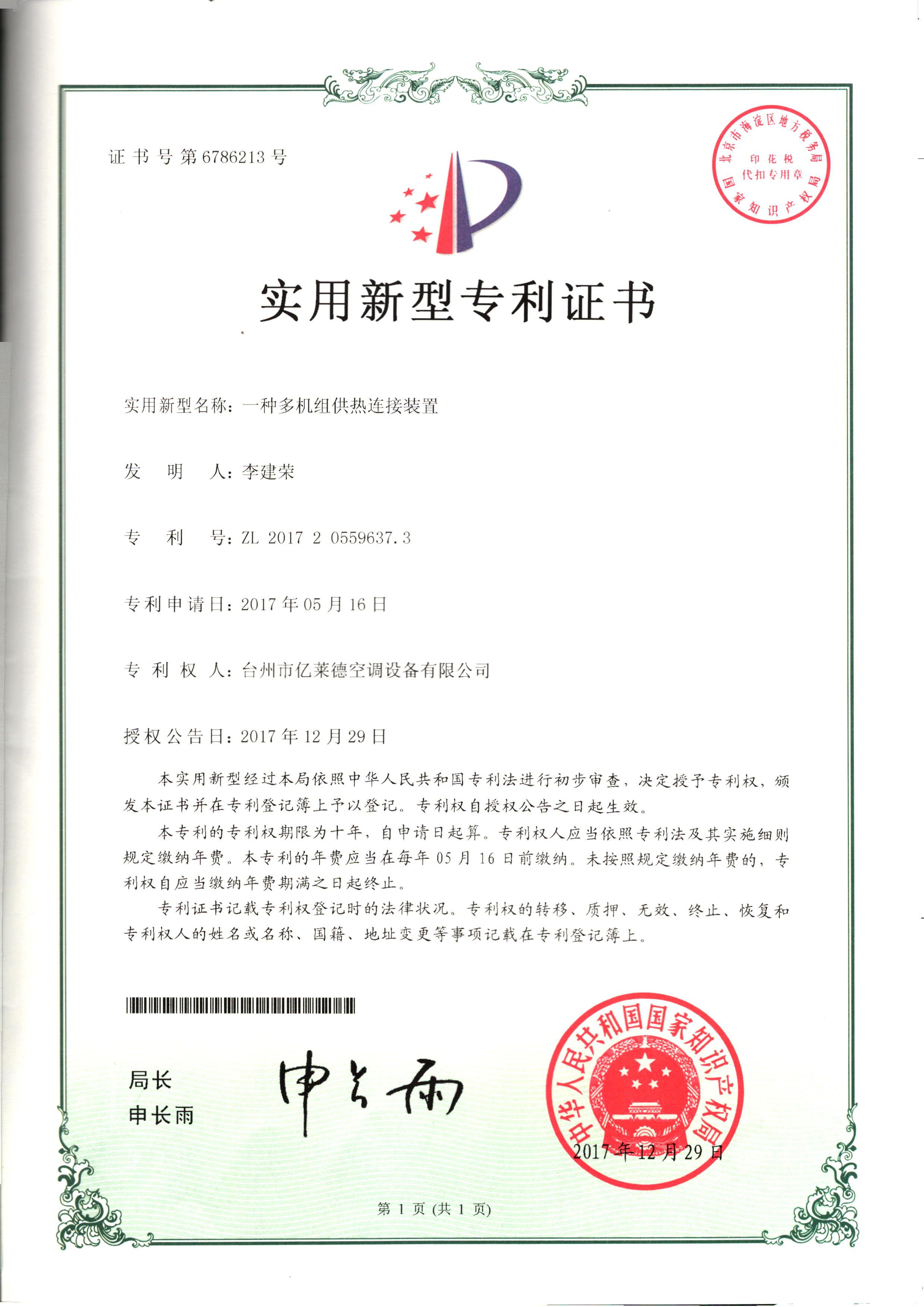 實(shí)用新型專利證書--一種室內(nèi)冷暖...