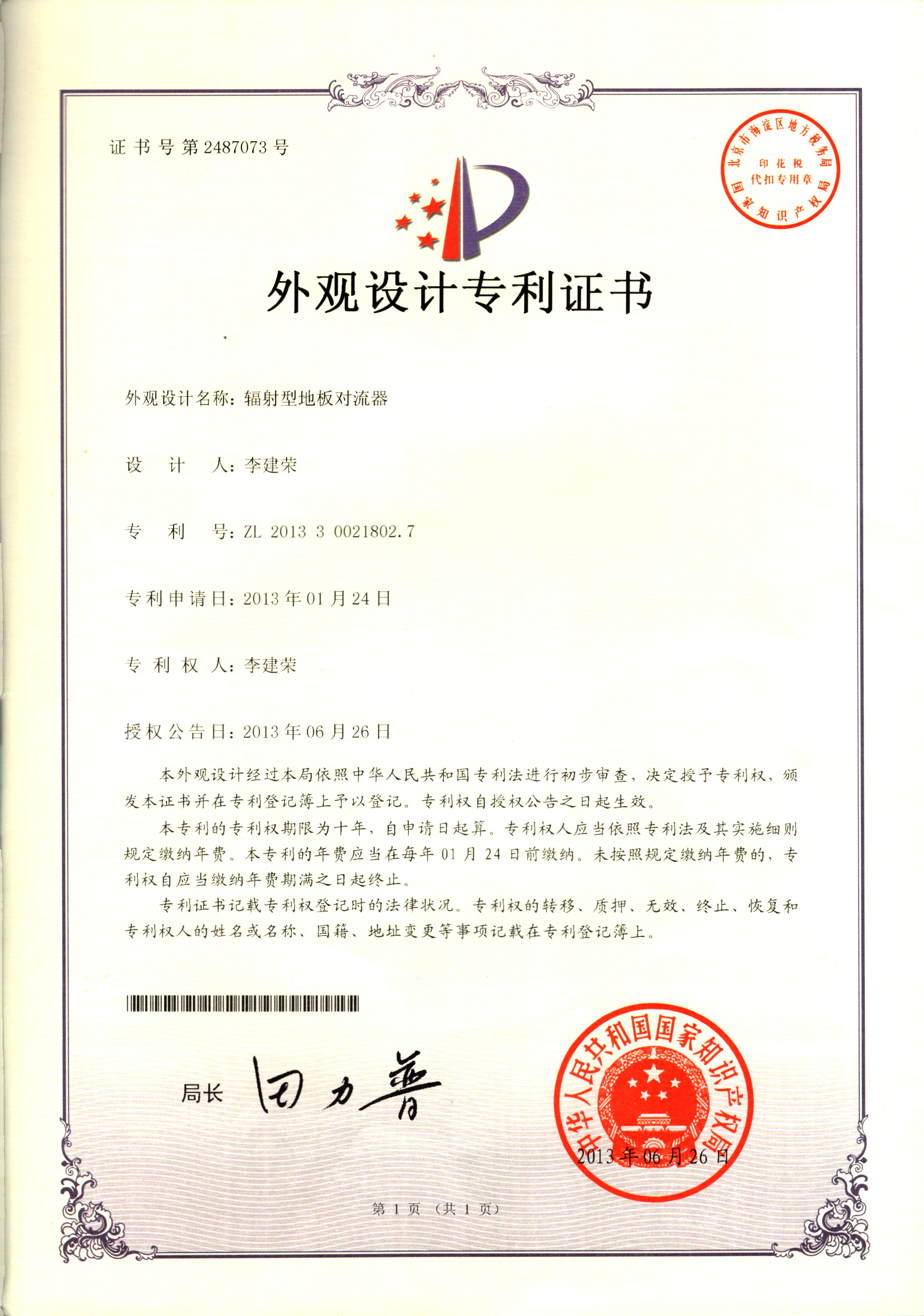 外觀設(shè)計(jì)專利證書--輻射型地板對(duì)...
