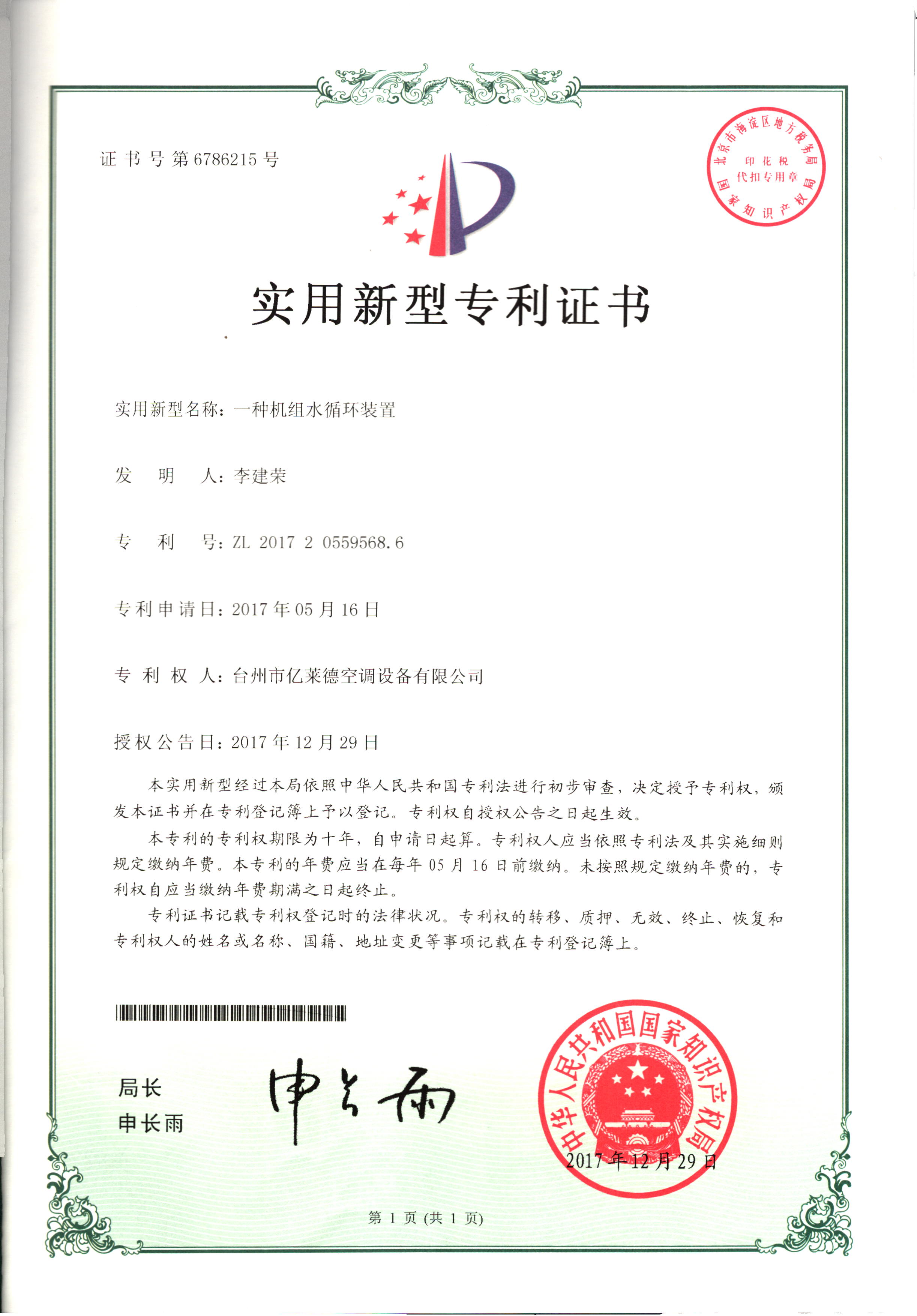 實(shí)用新型專利證書--一種機(jī)組水循...