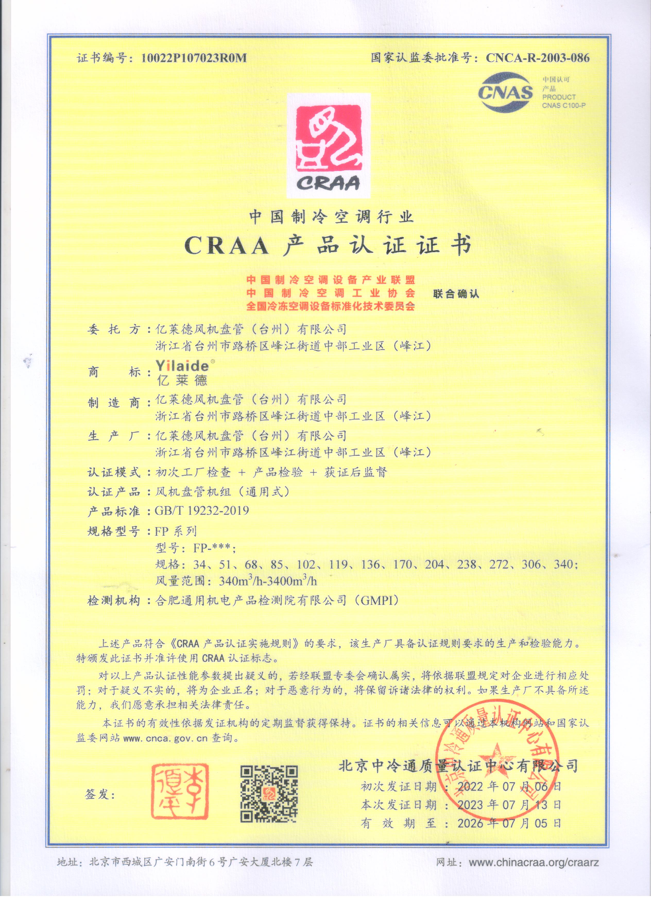CRAA產(chǎn)品認(rèn)證證書